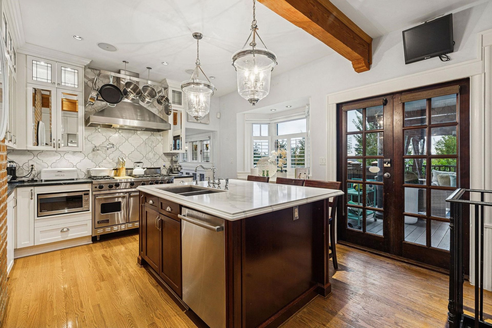 Inside, more than 5,000 sq ft of elegant living space unfolds through a series of refined, light-filled rooms framed by rich millwork, wainscoting, coffered ceilings, stained-glass windows, and two fireplaces. The grand foyer introduces a sense of scale and presence, leading to an elegant living room, private dining room, and a sensational gourmet kitchen that flows seamlessly to a sunny, west-facing entertainment sized deck and yard — perfect for gatherings and sunset dinners. The spacious family room completes the main level, offering both warmth and comfort.